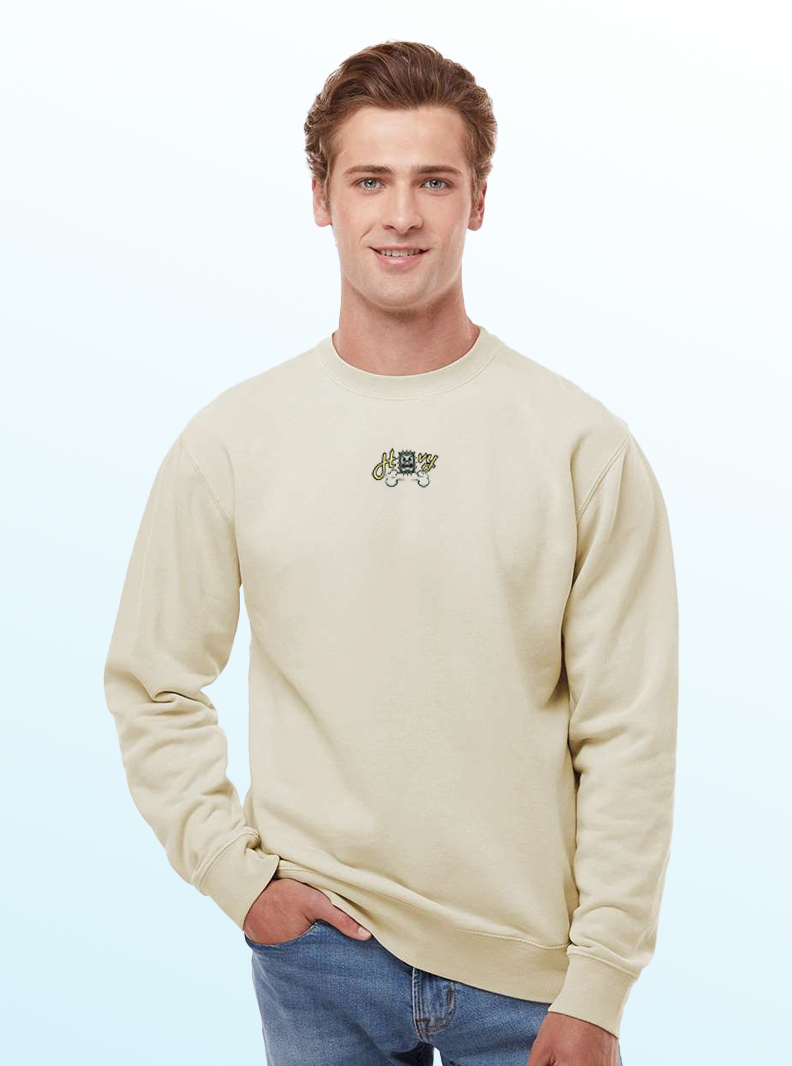 Custom “Heavy” typography paired with a powerful stone block motif — a nod to old-school game bosses — printed on a light blue premium crewneck for a clean, minimalist aesthetic.